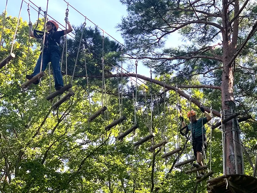 木々に囲まれた自然の中で、まるでサルになったかのように木から木へ渡っていく感覚は、普段の生活では味わえない非日常そのもの。小さなお子さんから大人まで楽しめるコースが用意されているので、家族や友人同士でも安心してチャレンジできます。