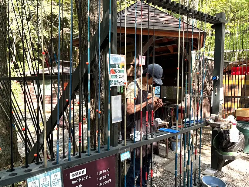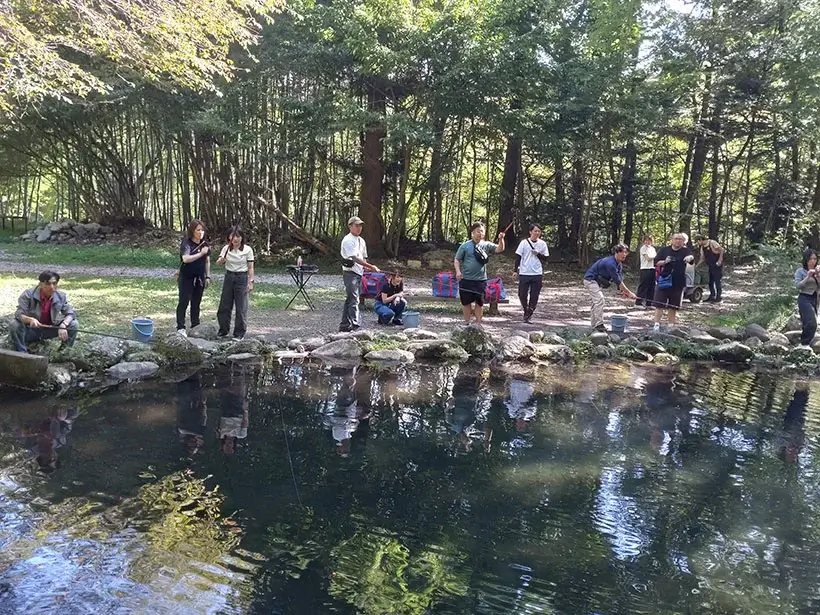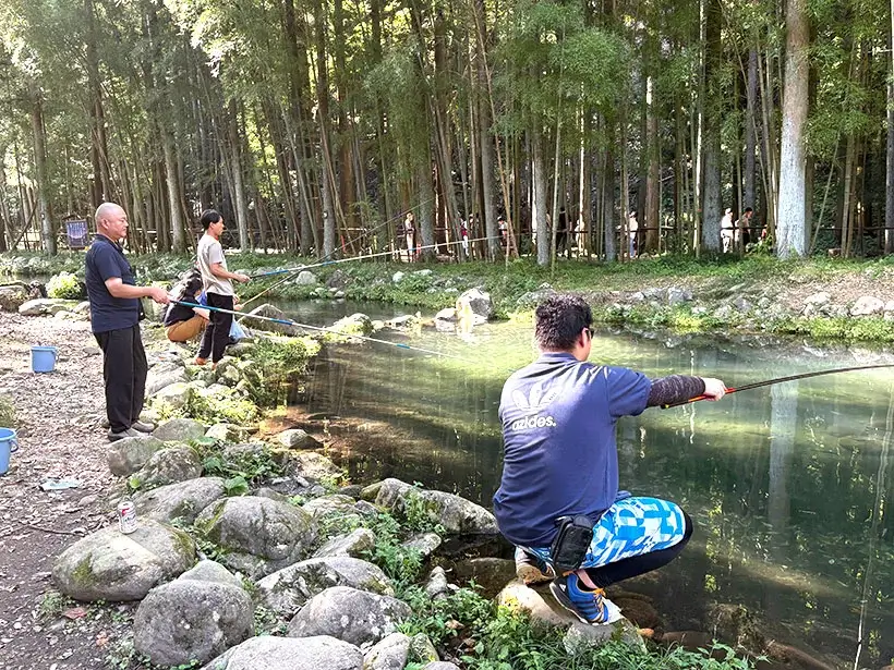 今回私たちは 「混合釣場/ニジマス or イワナ・ヤマメエリア」 を利用しました。透明感のある水の中を、元気に泳ぐ魚たちが見えて、竿を構える前からワクワクが止まりません。エサを付けて糸を垂らすと、すぐに魚が寄ってくる瞬間がわかり、まるで駆け引きをしているような感覚に。魚影が濃いので、釣り初心者でも楽しめる環境だと感じました。