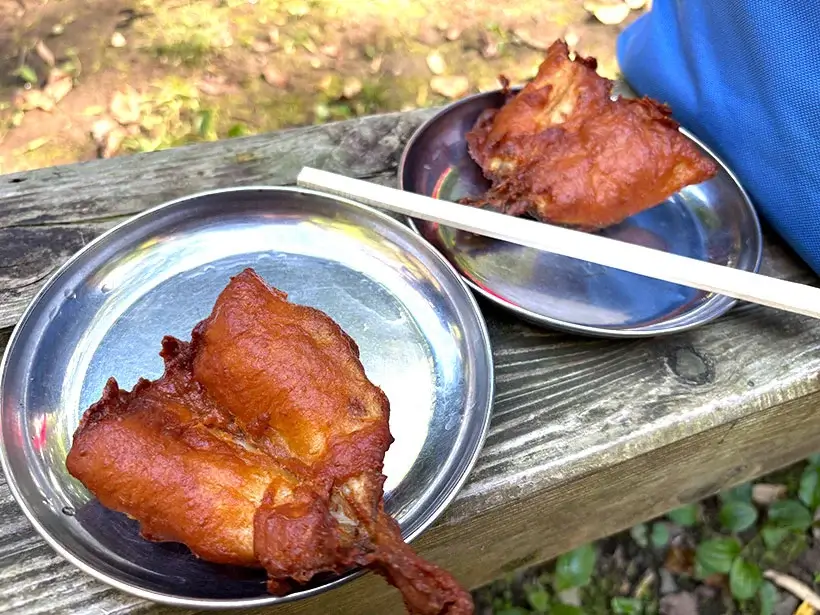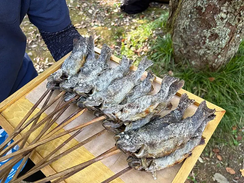 私たちは今回、釣ったニジマスを塩焼きと唐揚げにしてもらいました。炭火でじっくり焼かれた塩焼きは、皮はパリッと香ばしく、身はふっくら。川魚特有の臭みはまったくなく、塩加減も絶妙で、自然の中で食べる魚は格別でした。