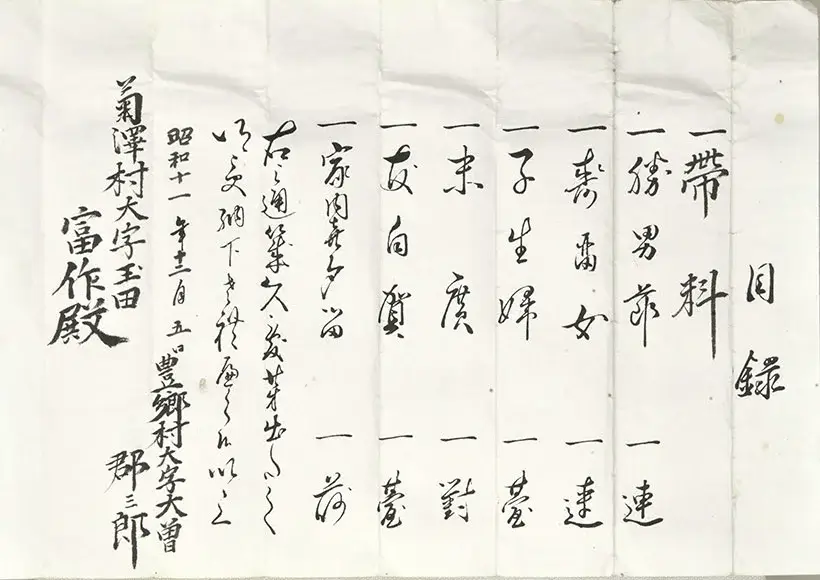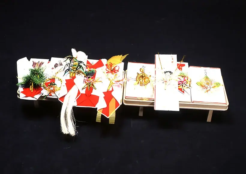 結納の品は必ず7品、もしくは9品などの奇数とし、勝男節(かつおぶし)、寿多女(するめ)、子生婦(こんぶ)、友志良賀(ともしらが)、末廣(すえひろ)、家内喜多留(かないきたる・やなぎだる)など、縁起の良い文字があらわされた。