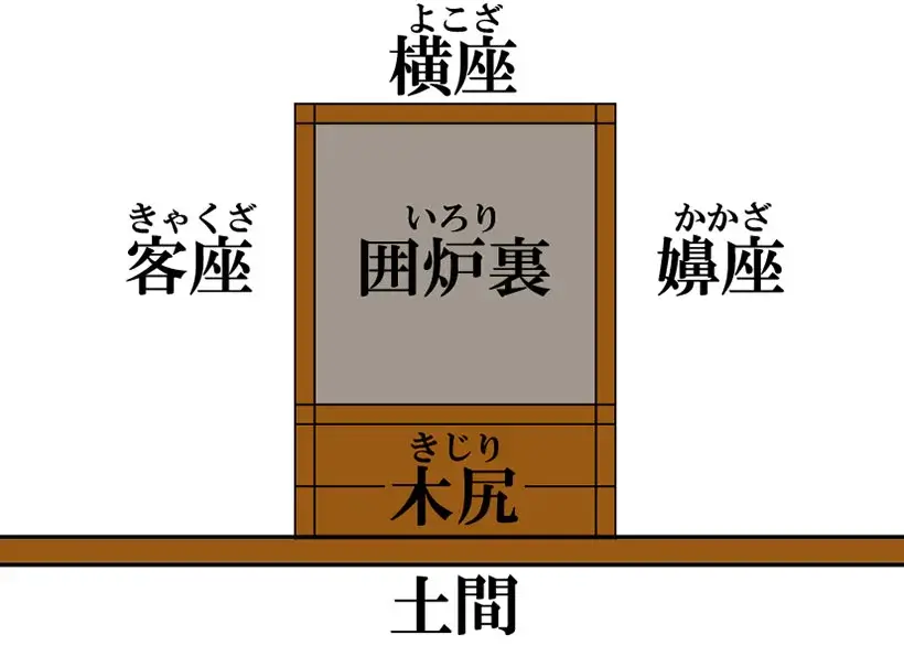 席に上座、下座があるように、囲炉裏を囲む座席にも決まりがある。土間から見て正面、大黒柱あるいは神棚や仏壇を背にするヨコザ(横座)が上座で、一家の主人が座った。この場所は、家の全体を見回すのにも都合がよい。横座の隣、台所に近いカカザ(嬶座)は主人の妻、その向かい側の出入口に近いキャクザ(客座)は来客者や年寄り、長男の席である。