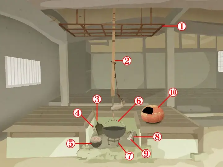 ①火棚 ②自在鉤 ③十能 ④火箸 ⑤火消し壷 ⑥鉄鍋 ⑦五徳 ⑧餅網 ⑨灰ならし ⑩炭入れ
