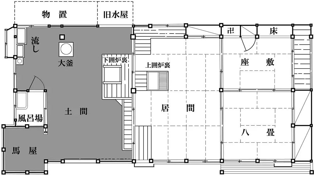 これらの民家の間取りを見ると半分が土間、もう半分が床上の部分からなる。土間は地面のまま、あるいは三和土(たたき)で固めた空間で、台所や風呂、馬屋などが置かれた。また、藁仕事や麻、葉煙草などの作業場となった。